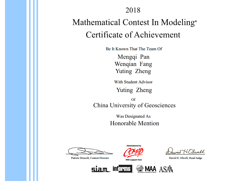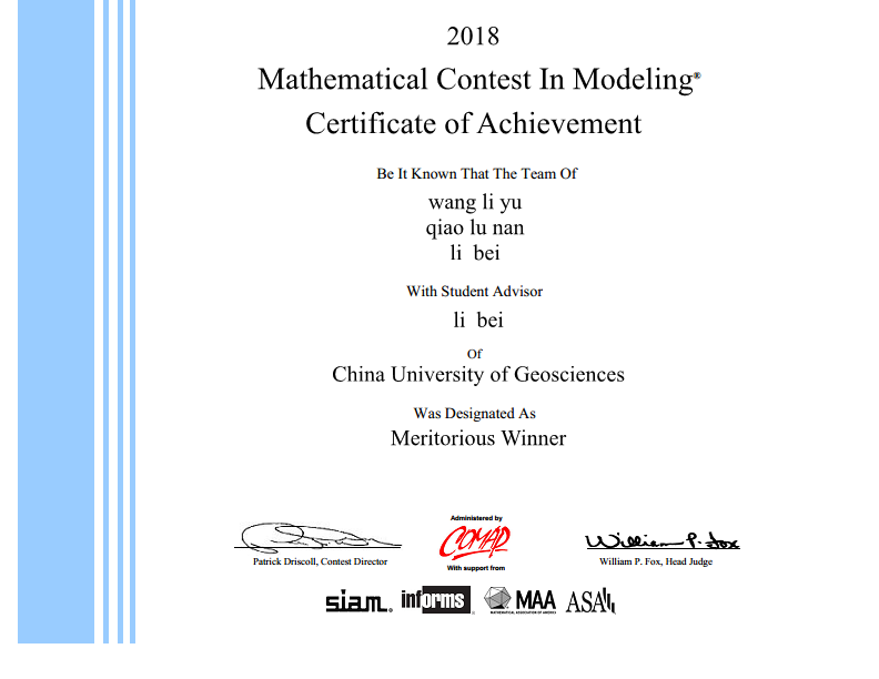 在与众多名校参赛队的激烈角逐中,我校资源а√天堂中文中文在线三名同学李贝(2016级硕士计算机科学与技术专业)、乔璐楠(2016级硕士计算机科学与技术专业)、王利宇(2017级硕士计算机科学与技术专业)获得了该项赛事一等奖(Meritorious Winner)。另外,资源а√天堂中文中文在线潘孟琦(2016级硕士计算机科学与技术专业)、数理学院方文倩(2017级硕士信号处理与智能计算)、资源а√天堂中文中文在线郑雨婷(2017级硕士计算机科学与技术专业)三位同学获该项赛事二等奖(Honorable Mention)。