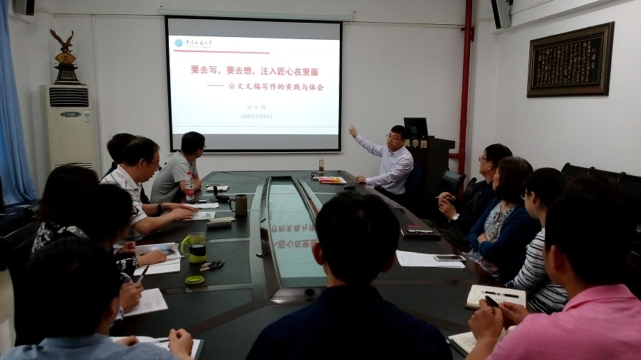 (通讯员:石剑峰)科学规范、严谨有序的管理工作,须以高质量的文件为基础。文件的质量,某种程度上影响甚至决定了学校的管理水平。为了提高我院公文写作水平和能力,应资源а√天堂中文中文在线党委书记吕军教授的邀请,校办主任刘彦博研究员于5月10日上午10点,在北一楼122会议室为资源а√天堂中文中文在线办公室、学工组、以及部分党政干部带来了一堂生动、深入的公文写作培训课。
