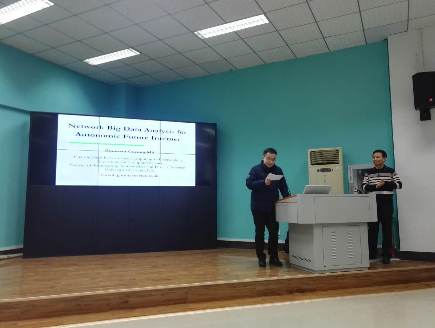 1月2日,应资源а√天堂中文中文在线院长王力哲教授的邀请,英国Exeter大学(计算机学科首席教授)闵革勇教授来院访问,并做了题为“Network Big Data Analysis for Future Intelligent Internet”的学术报告。闵革勇教授在计算机/通信学科的IEEE与ACM国际顶级期刊上发表学术论文140余篇,多次获得会议最佳论文奖,现任6个国际期刊的编委(含计算机学科顶级国际期刊IEEE Transactions on Computers),18个国际期刊专刊的编辑,先后担任了18个国际会议/研讨会的大会主席和程序委员会主席,80多个国际学术会议的程序委员会委员,并在多个国际学术会议与研讨会上做大会特邀主题报告。学术报告在王力哲教授的郑重介绍下正式开始。