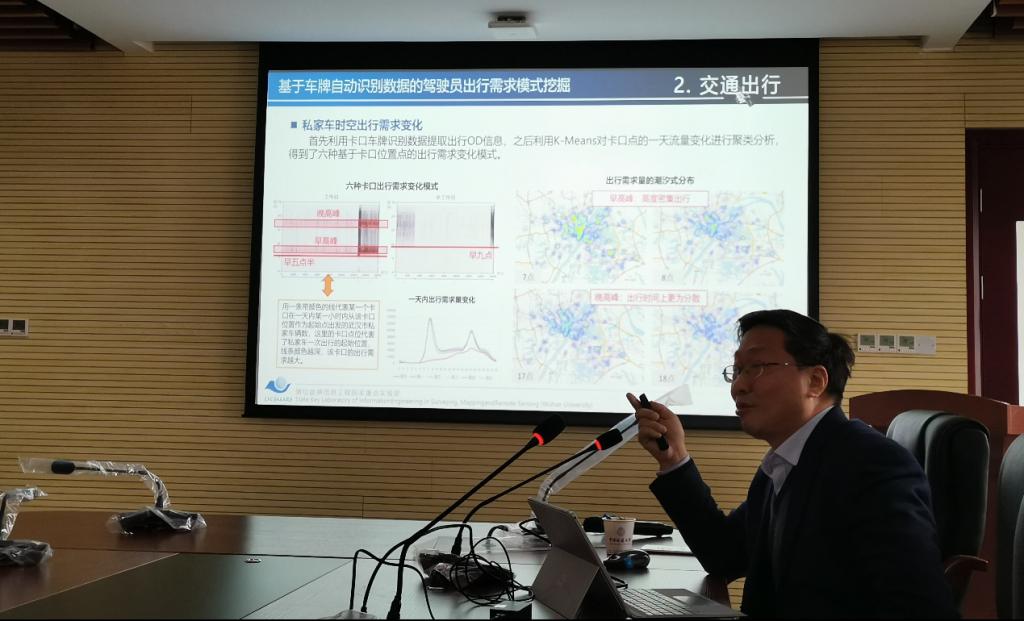 朱教授从智慧交通的现状、关键技术方法、应用与成效以及拓展与展望4个方面展开了精彩的报告。重点介绍了团队今年来在城市交管时空大数据接入、管理、分析与短时交通预测方面的相关研究成果,具体包括时空大数据的碰撞分析技术、基于卷积的道路短时交通预测、基于车牌自动识别数据的驾驶员出行需求模式挖掘、路网核密度估计并行算法、交通隐患预测、室内外一体化定位导航技术、市内导航AR三维可视化技术等。接着展示的“武汉交警数据大脑——智慧监管”系统的应用成效与运行现状。最后,朱教授结合团队目前正在进行的研究工作,对“GIS+AI”、“GIS+大数据”、“GIS+区块链”、“GIS+导航”进行了展望。