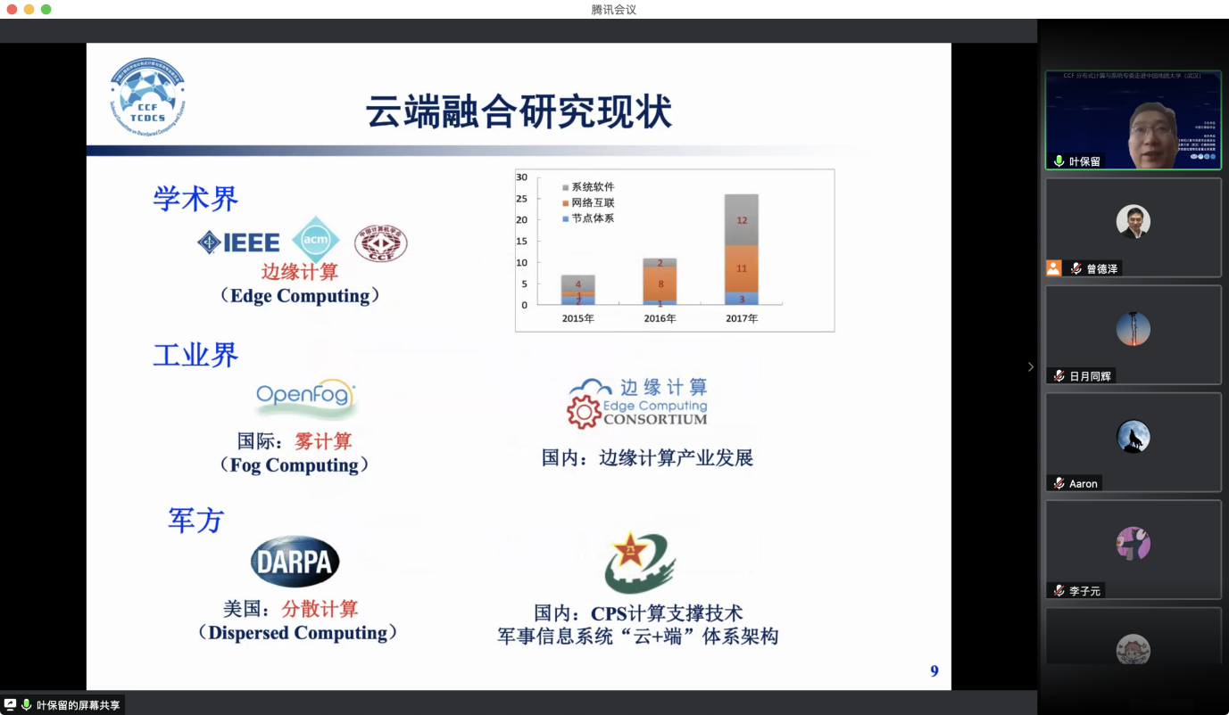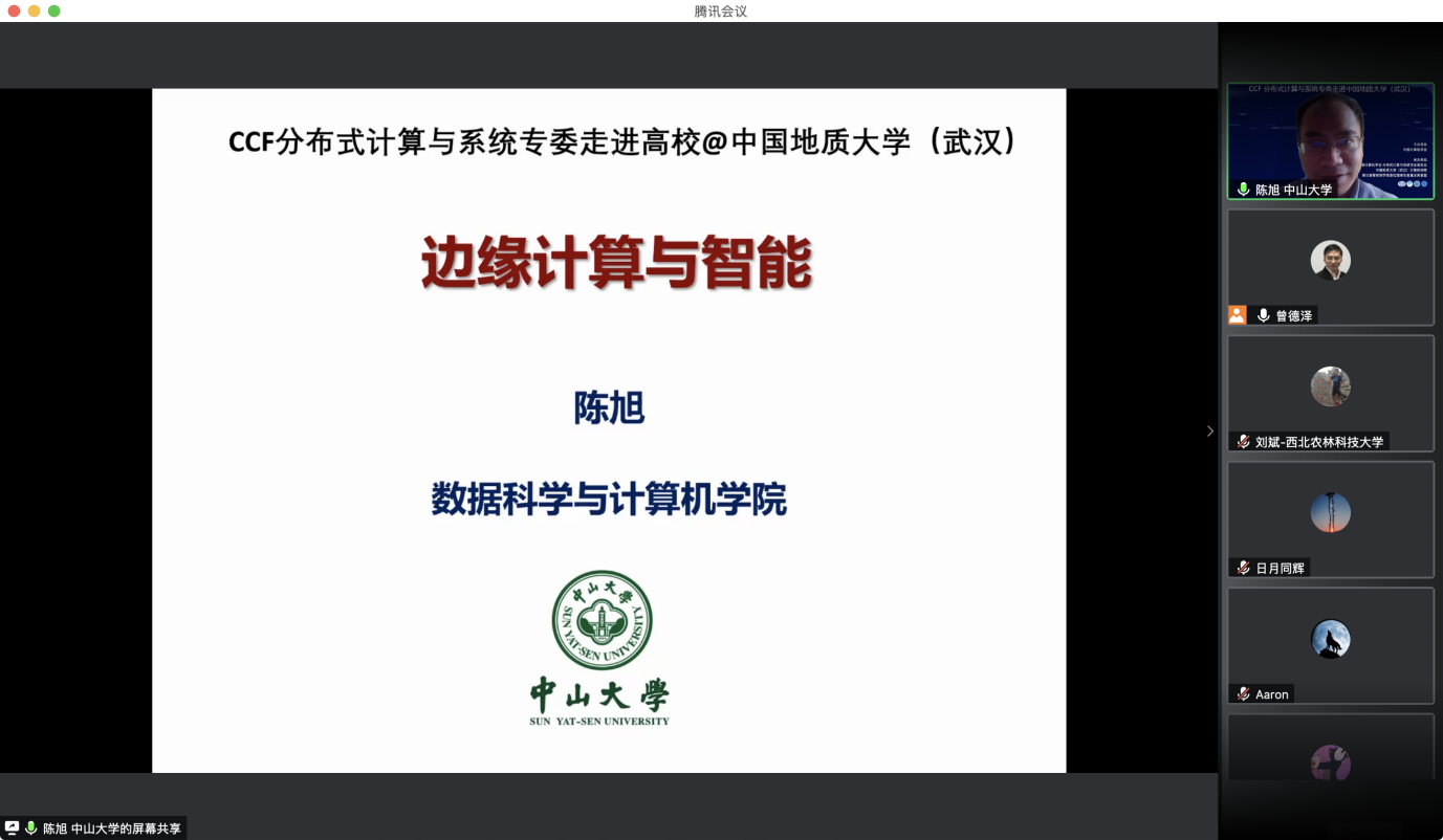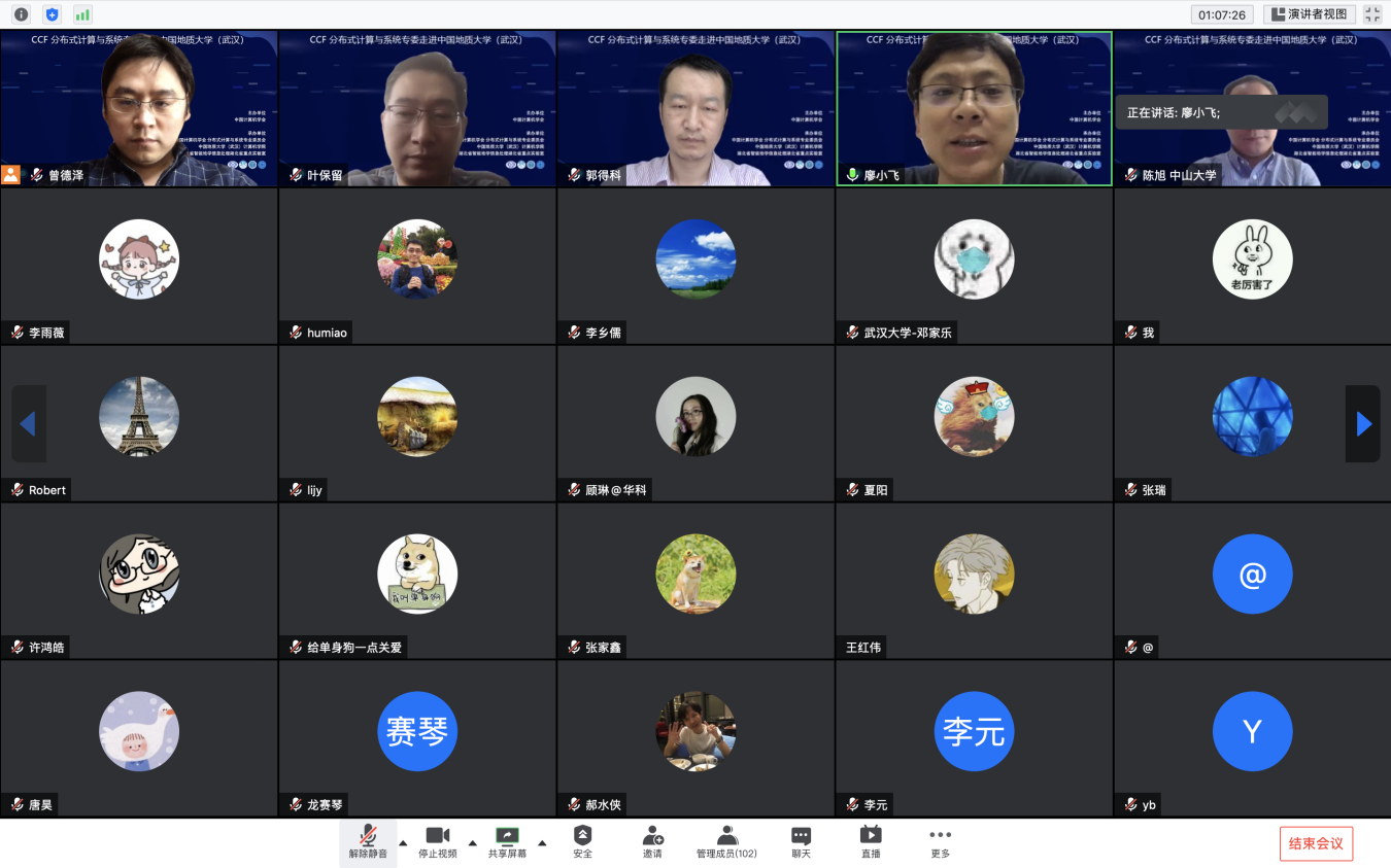 “CCF分布式计算与系统专委走进高校系列报告会”第1期——走进中国地质大学(武汉)于 2020 年7 月 25日在线成功举办。该活动由中国计算机学会主办,CCF会分布式计算与系统专业委员会、中国地质大学(武汉)资源а√天堂中文中文在线、智能地学信息处理湖北省重点实验室承办。分布式计算与系统专委会委员国防科技大学郭得科教授、南京大学叶保留教授、中山大学陈旭教授应邀作学术报告,中国地质大学(武汉)曾德泽教授主持会议。会议采用线上腾讯会议和 B 站会议直播的方式,下午参加腾讯会议的人气峰值达175,观看直播的人气峰值达300余人,累计参会人数近500人。参会人员来自包括中国地质大学(武汉)、南京大学、中山大学、国防科技大学、华中科技大学、武汉大学、南开大学、武汉理工大学、中南财政政法大学、华中师范大学、武汉工程大学、湖北大学、西南大学、南京邮电大学、南京理工大学等多所高校。