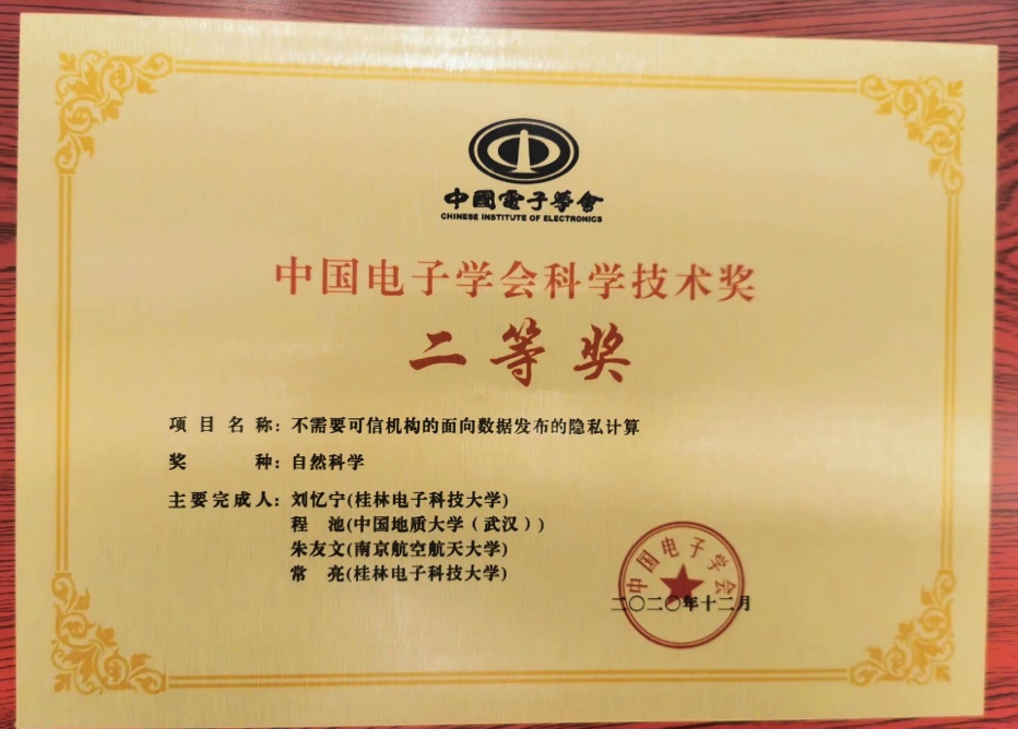 (通讯员:章丽平)2021年4月17-18日,中国电子学会2020年度科学技术奖励大会在重庆举行。资源а√天堂中文中文在线信息安全系程池老师与桂林电子科技大学、南京航空航天大学的学者共同完成的“不需要可信机构的面向数据发布的隐私计算”荣获2020年度中国电子学会科学技术奖自然科学二等奖。郝跃院士、刘明院士等23位院士出席大会并颁奖。