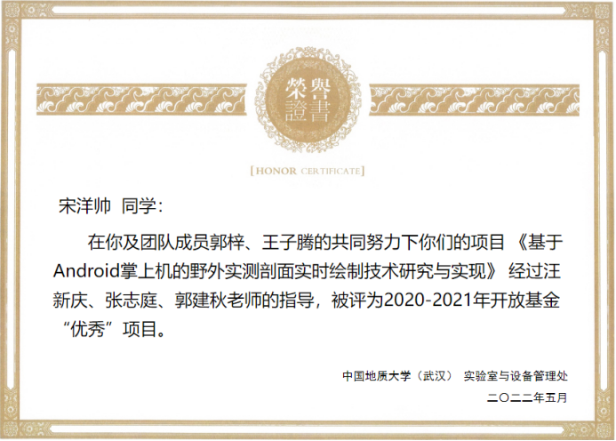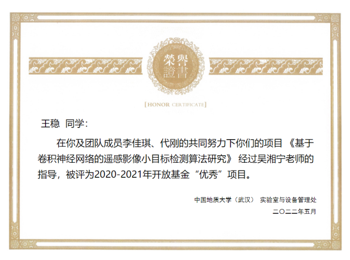 (通讯员:黄燕霞)近日,从实验室与设备管理处获悉,我院在2020-2021学年度教学实验室开放基金项目验收评审中荣获佳绩。张志庭、郭建秋指导的学生团队项目《基于Android掌上机的野外实测剖面实时绘制技术研究与实现》(学生负责人:宋洋帅)、吴湘宁老师指导的项目《基于卷积神经网络的遥感影像小目标检测算法研究》(学生负责人:王稳),在考评中获评优秀,同时资源а√天堂中文中文在线被评为优秀项目管理单位。