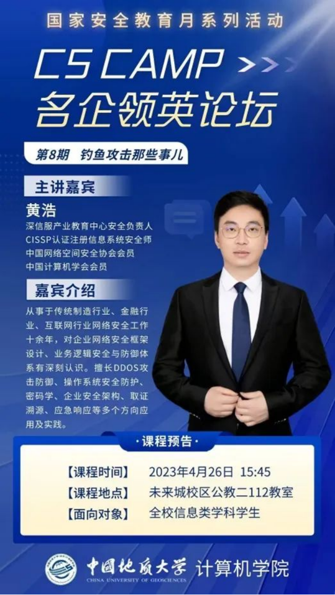 首先,主讲人黄浩介绍了什么是钓鱼攻击,并播放了《黑客军团》中的片段,展示了信息搜集过程。具体介绍了钓鱼准备、钓鱼方式等导致钓鱼成功的各个要素,让大家对钓鱼攻击有了更加深刻的认识。同时,进一步介绍了确保邮件安全的措施,以及通过哪些途径,我们的信息可能会泄露出去。最后,主讲人介绍了如何防止钓鱼攻击。在讲座结束后,进行现场互动,通过回答大家提出的问题,进一步介绍当前钓鱼攻击的方式和如何防止自己的信息泄露。