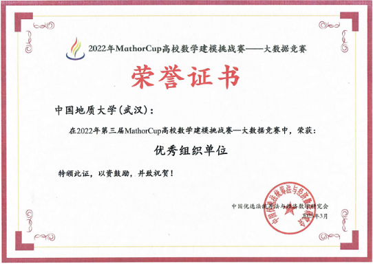2023年3月13日, 2022年第三届MathorCup高校数学建模挑战赛——大数据竞赛落下帷幕。中国地质大学(武汉)资源а√天堂中文中文在线组织队伍参加本次比赛,并取得了一等奖5项、二等奖3项以及三等奖8项的优异成绩,同时我校也被授予优秀组织单位奖。