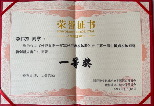 本次竞赛从2023年2月开始到作品提交结束,整个过程历时五个月。李伟杰等五名同学在邱芹军、刘郑和陶留锋三名老师的指导下,查阅了虚拟地理环境的文献资料,师生讨论确实赛道与选题并定期组织会议完成进度,对作品进行反复修改与完善,认真撰写项目实施方案,最终提交了出色的作品,通过专家初审评阅和现场汇报等环节的严格筛选,他们最终脱颖而出,荣获一等奖。他们的杰出表现展现了我院学子的才华,彰显了我院学子在学术和团队合作方面的卓越素养。