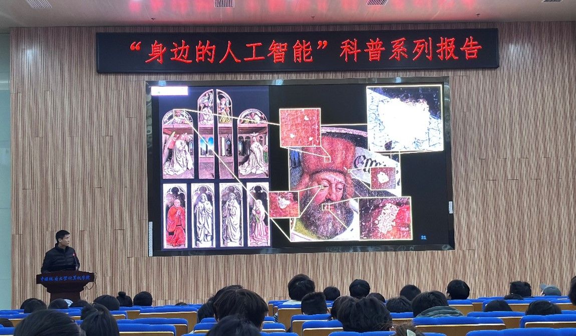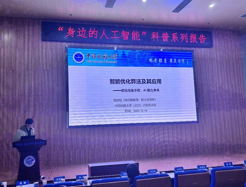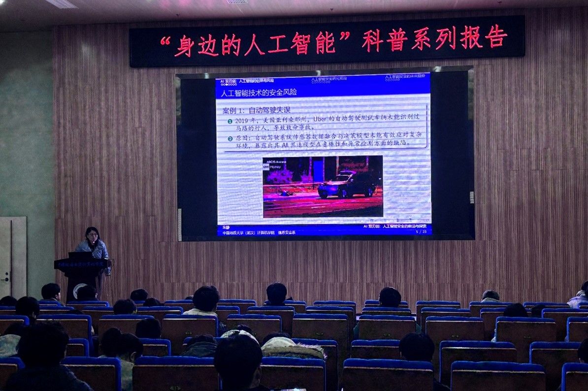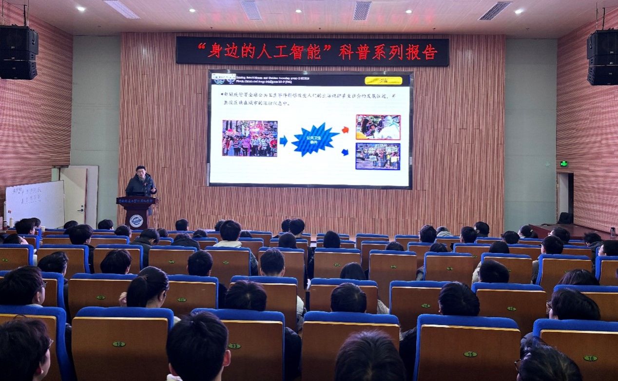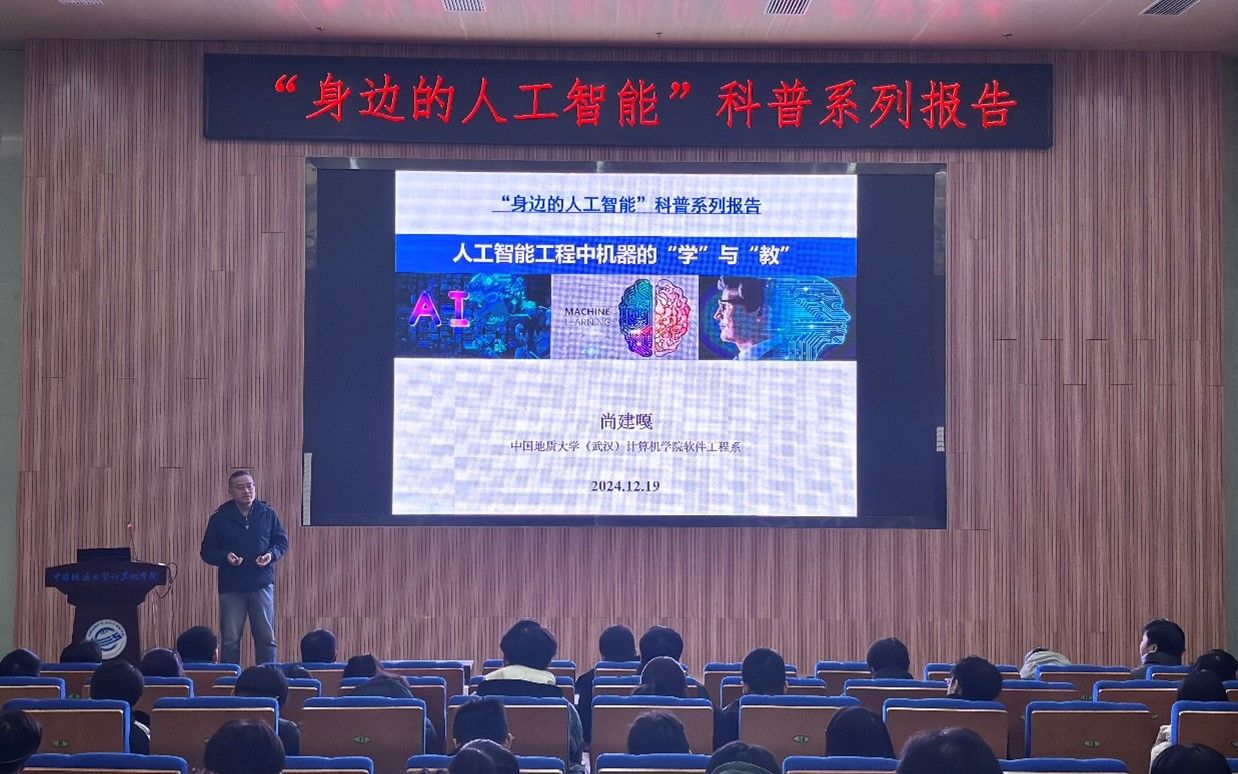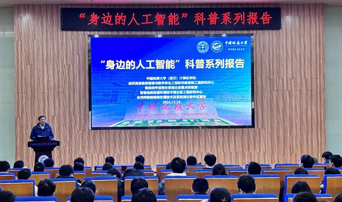 习近平总书记指出:“科技创新、科学普及是实现创新发展的两翼,要把科学普及放在与科技创新同等重要的位置”。为促进我院科学技术普及工作,弘扬科学精神,激发创新活力,12月19日下午,学院举办的“身边的人工智能”科普系列报告活动在计科楼126报告厅进行,邀请了武汉大学测绘遥感与信息工程国家重点实验室武辰教授、我院数据科学与大数据系李程俊副教授、计算机应用系陈麒玉教授、智能科学与技术系黄绍广教授、软件工程系尚建嘎教授、信息安全系朱静副教授、计算机科学与技术系甄慧翔副教授作专题科普报告,学院副院长刘刚主持活动。报告会得到了自然资源信息管理与数字孪生工程软件教育部工程研究中心、智能地学信息处理湖北省重点实验室、智慧地质资源环境技术湖北省工程研究中心、全空间智能信息处理技术及系统湖北省中试基地等科研平台的支持,也是我院建设的武汉市科普基地的活动之一。200余名师生参加了本次活动。