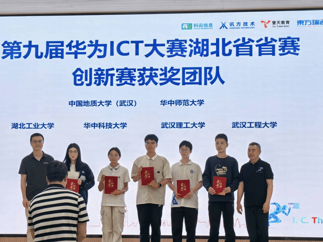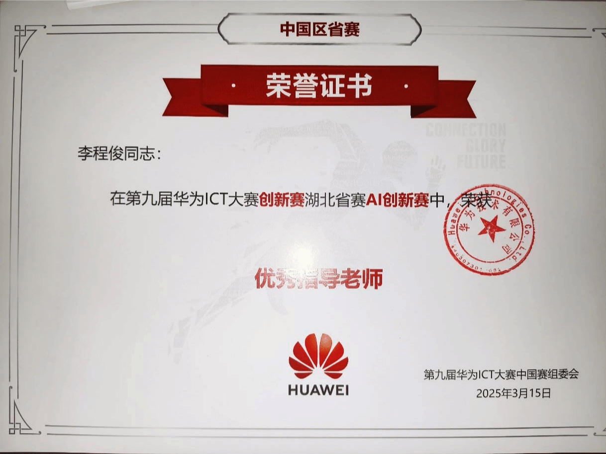 4月28日,第九届华为ICT大赛湖北省赛颁奖典礼在湖北科技职业学院关山校区隆重举行。我院大数据系李程俊老师在“第九届华为ICT大赛创新赛湖北省赛AI创新赛”中获优秀指导老师,学校为“第九届华为ICT大赛创新赛湖北省赛获奖团队”。