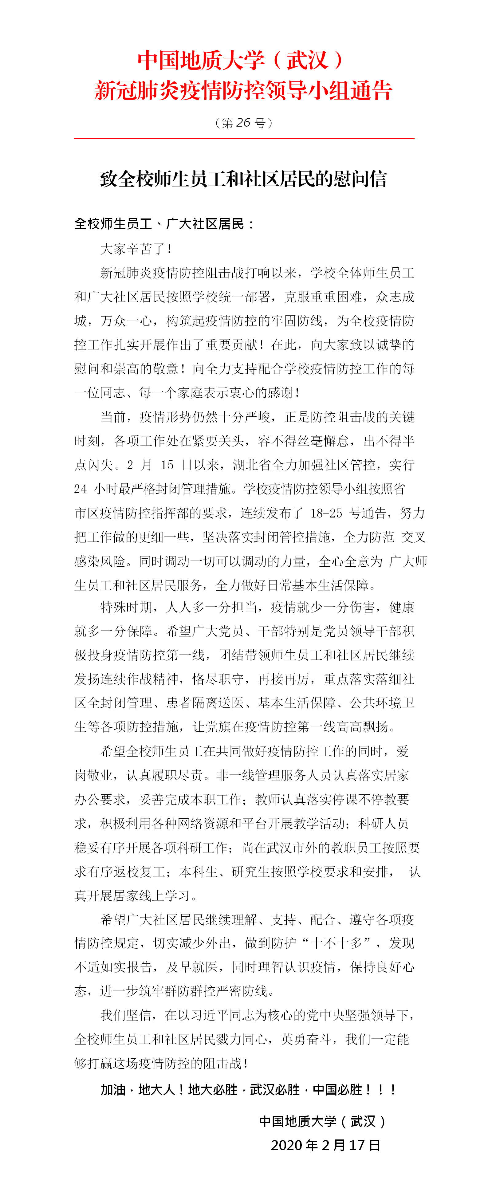 校疫情防控领导小组:致全校师生员工和社区居民的慰问信