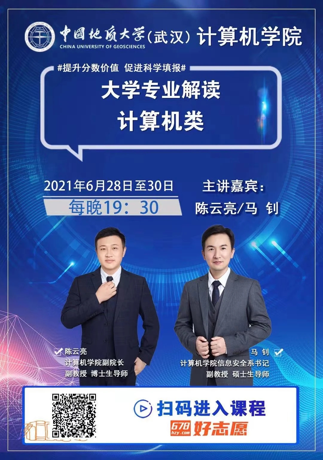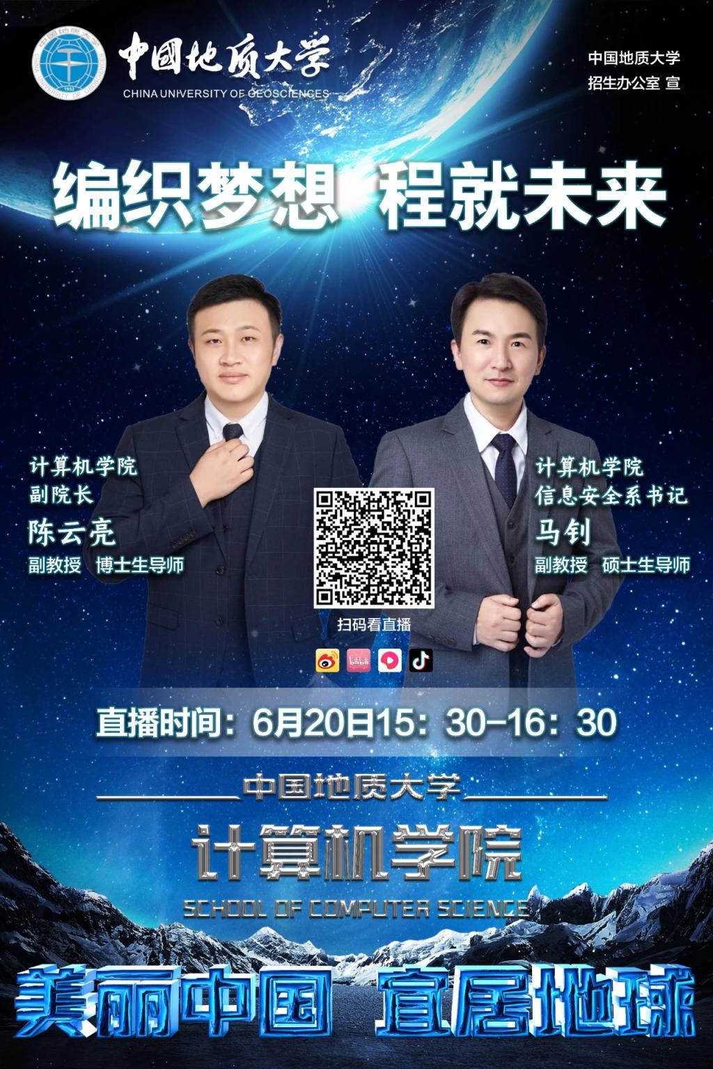(通讯员孙彦钦)中国地质大学(武汉)资源а√天堂中文中文在线专场招生宣讲和计算机专业解读直播将于6月20日15:30、19:00开讲。另外,自6月28日起至30日每晚19:30设有针对高考志愿填报的计算机专业解读直播,欢迎广大家长、学子扫码收看!