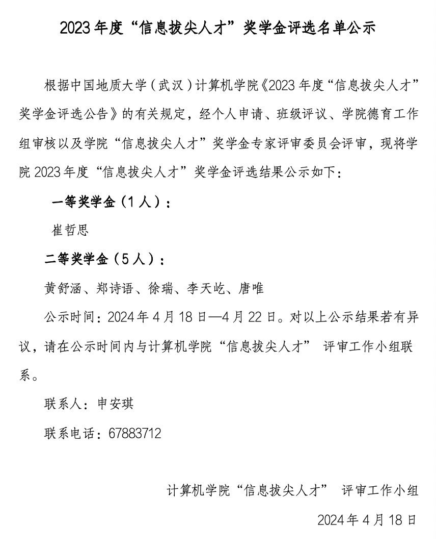 2023年度“信息拔尖人才”奖学金评选名单公示