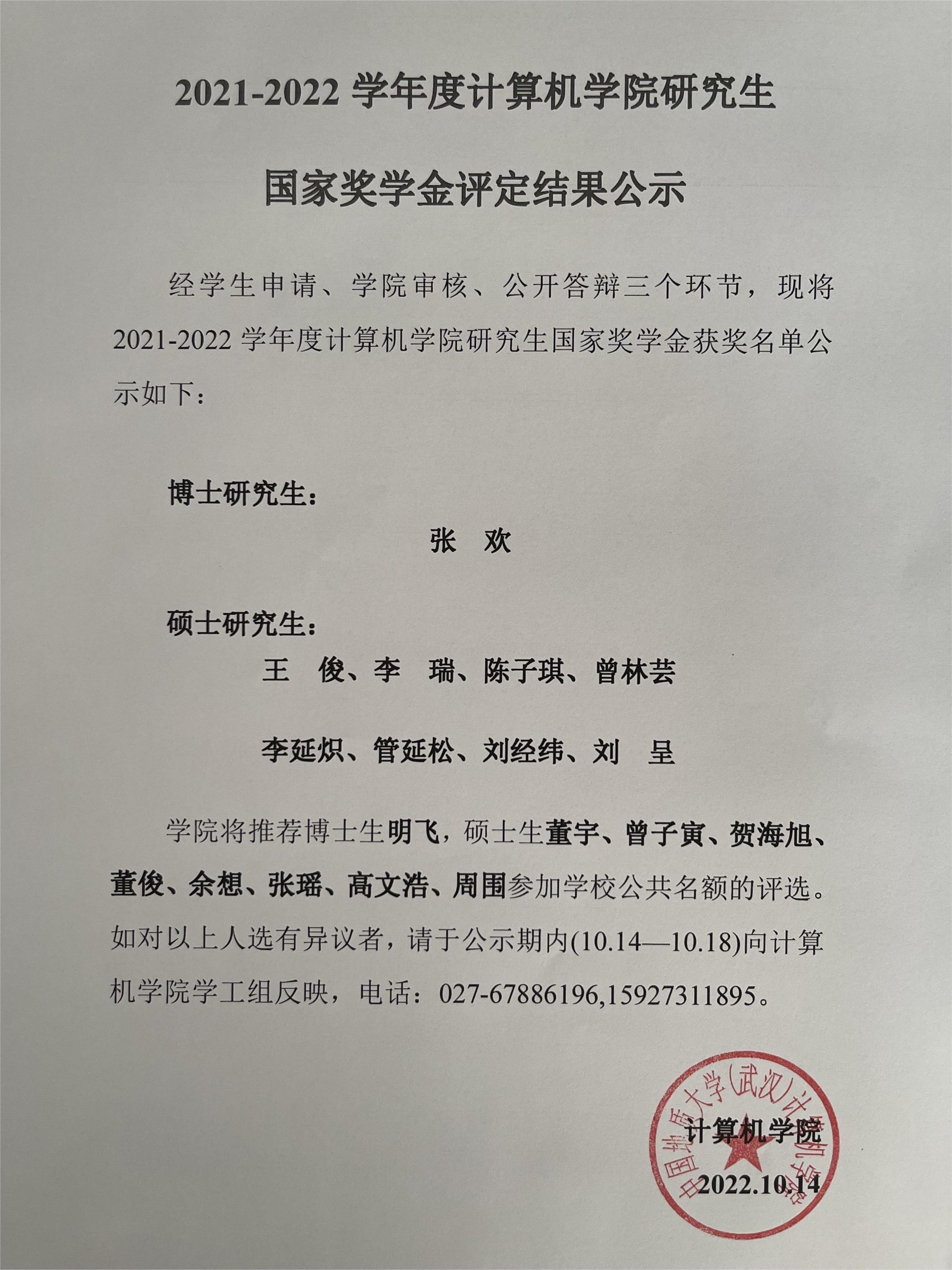 2021-2022学年度资源а√天堂中文中文在线研究生国家奖学金评定结果公示
