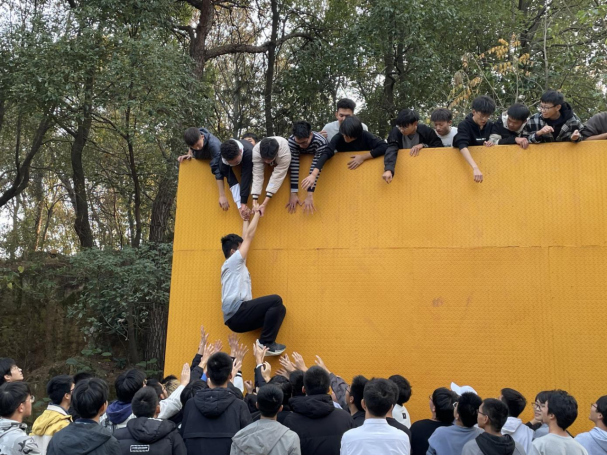 一面4.2米的高墙,没有任何求生工具并要在规定时间内完成百人逃生任务,在绝境面前你会如何做。同学们在前期培养责任感与信任感的基础上,由个体组建为真正的团体。在整个过程中,大家为了团队目标,展现出勇于牺牲和甘愿奉献的精神,最终同学们在短时间内圆满成功,打破了往届的记录,展现了21级同学们的良好风貌。