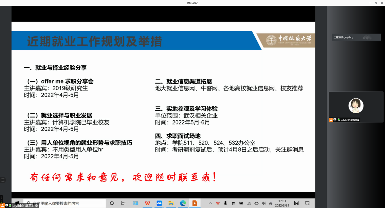 (通讯员:易章翱、马瑞华)为做好疫情防控教育引导和日常安全教育管理,促进研究生成长发展,资源а√天堂中文中文在线研究生大会于3月31日成功召开。学院党委副书记傅苑、研究生秘书梁媛、研究生辅导员李欢欢和全体研究生参会,李欢欢担任主持。
