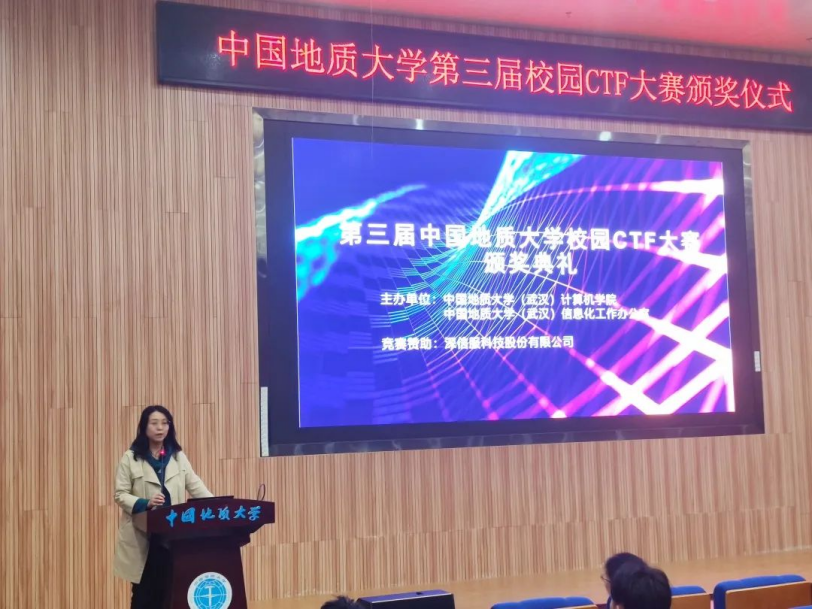 (通讯员:王博闻、马瑞华)4月17日,由中国地质大学(武汉)资源а√天堂中文中文在线与学校信息化工作办公室联合主办,深信服科技股份有限公司赞助的第三届校园CTF大赛圆满落幕。资源а√天堂中文中文在线党委副书记傅苑、信息安全系主任程池、副主任朱静、教师代表黄诗勇及联合主办单位信息化工作室代表高浪作为嘉宾出席颁奖仪式。比赛共有302名来自全校各个年级的本科生注册参赛。为鼓励学生参与,增添竞赛乐趣,此次竞赛单列老生组和新生组,分设一、二、三等奖与优秀奖,并为解出特定题目的选手赠送礼物。