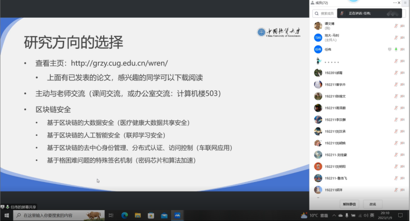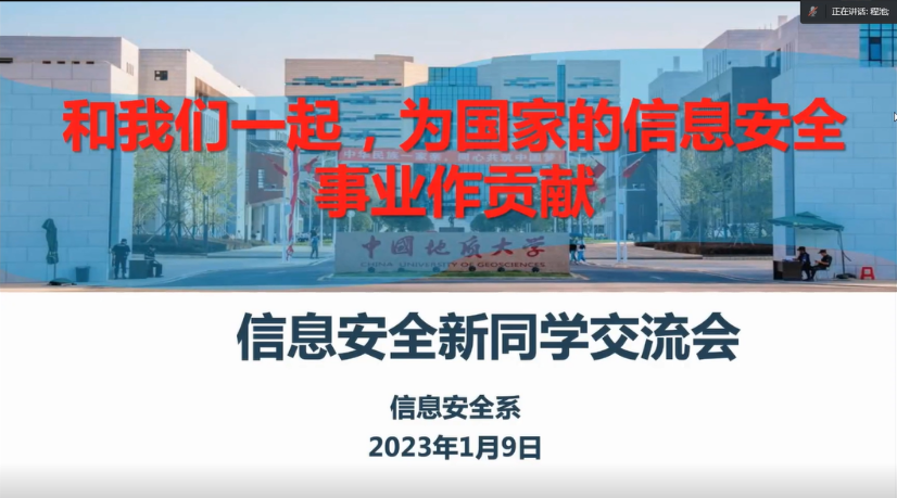 2023年1月9日晚,为了让同学们尽快熟悉信息安全专业情况,融入到信安大家庭,中国地质大学(武汉)资源а√天堂中文中文在线信息安全专业2021级师生新春见面会暨“1111”人才培养计划发布会通过腾讯会议在线上顺利举办。资源а√天堂中文中文在线党委副书记傅苑、资源а√天堂中文中文在线信息安全系全体教师、资源а√天堂中文中文在线信息安全专业2021级全体同学和2021级辅导员谭文博参加本次会议,会议由信息安全系党支部书记马钊老师主持。