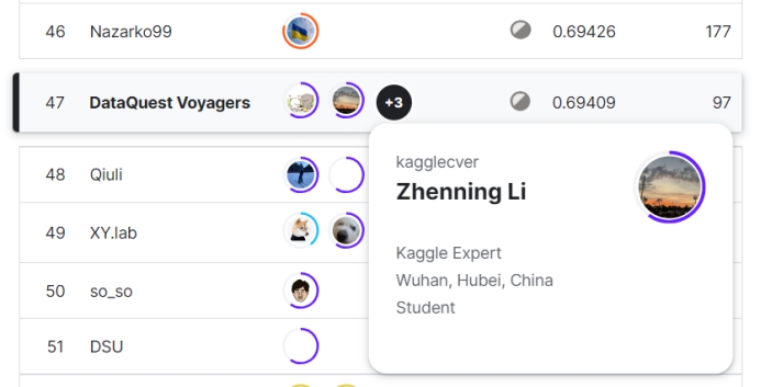 在此次的五场竞赛中,我院数据科学与大数据技术系2020级中美本科教育合作办学项目本科生李祯宁同学以及谭以宁、秦浩然、陈予贤三人组成的队伍SatoshiShimomoto发挥出色,获得佳绩。Kaggle创办于2010年,目前已经被Google收购,拥有超过80万名数据科学家用户,是全球顶级的数据科学竞赛平台,在数据科学领域享有盛名。Kaggle的使命是通过众包的方式,解决世界上最棘手的问题,同时推动机器学习和数据科学的发展。对参赛者来说,不仅是考验自己能力,更是一场实战经验。