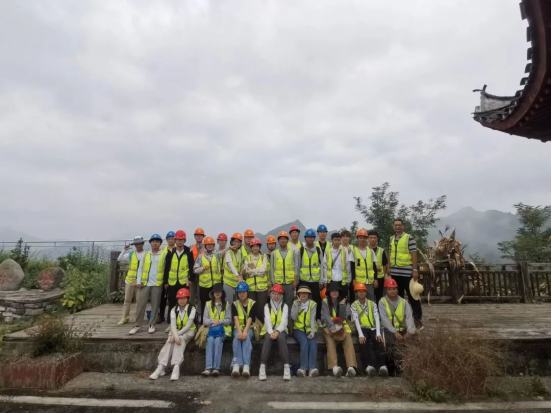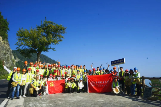 在蓝天白云、绿水绕山的美景下,空信一班和空信二班的师生们展开中国地质大学(武汉)资源а√天堂中文中文在线的旗帜,在观景台上合影留念。