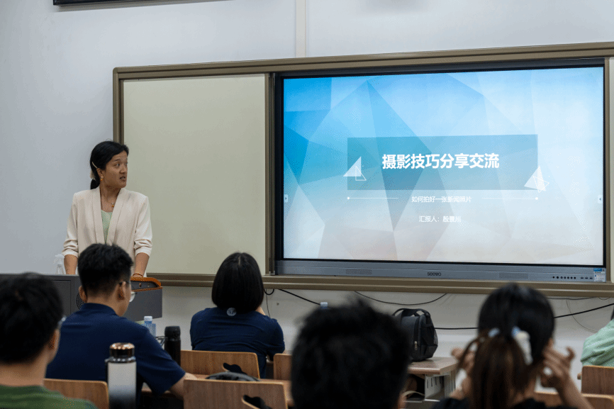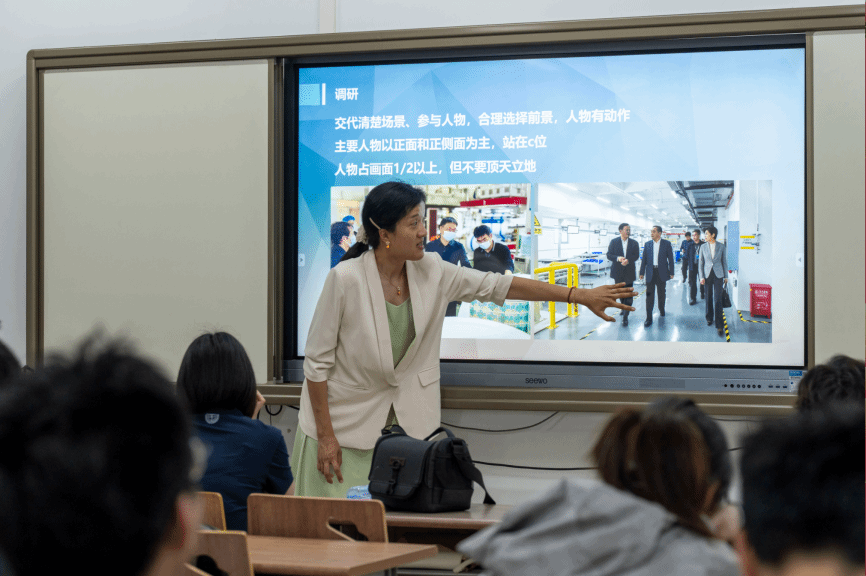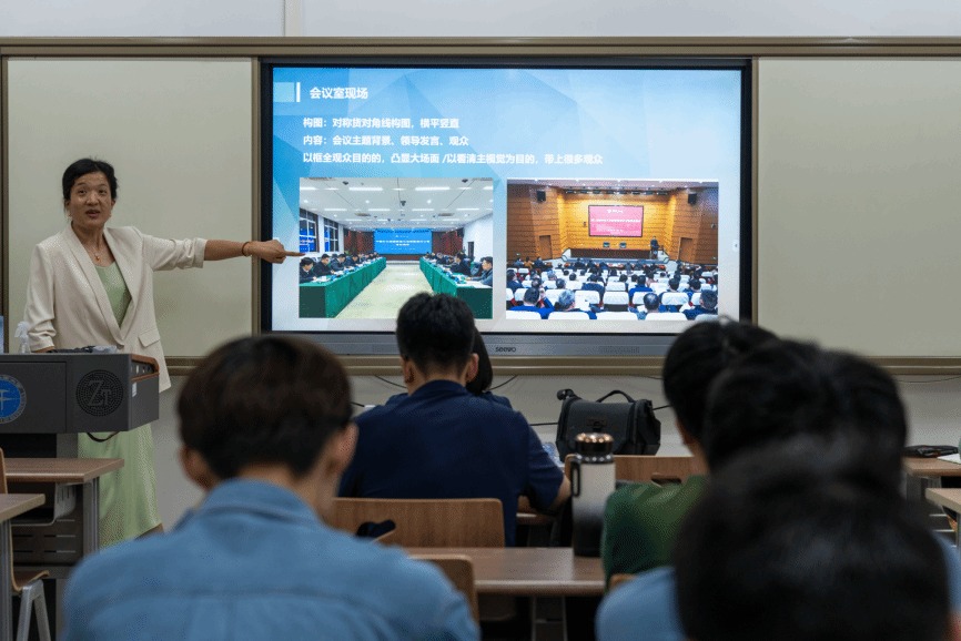 殷老师谈到,不论去什么活动场合进行拍摄,拍摄前都需要了解活动流程、在现场提前调整参数,以及多拍全拍。对于活动的每一个环节,包括现场全景、嘉宾发言、人物互动等均需拍摄。作为示例,她提到,在各类会议、报告、培训场所中,要力求构图对称、横平竖直,合影要不偏不倚,不缺不漏;在各类参观、调研场所中,人物要有动作,既展示环境前景,又需囊括人物互动;在节日慰问类场景中,要拍合影、拍过程,在连拍中选择最好的一张;在活动类场景中,拍摄者要站在主办方视角、参与者视角、拍摄者视角三个角度选择拍摄内容,立体地展现活动样貌。