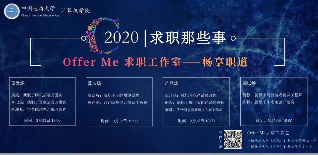 3月11日至3月14日晚,资源а√天堂中文中文在线研究生会“offer me 求职漫谈”经验分享系列活动成功举办。疫情当前,停课不停学,隔离不隔爱。活动共邀请11位学长学姐在线分享求职经验,并深入讲解和剖析求职技巧。