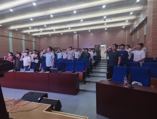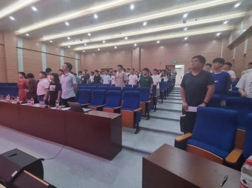 会议开始,全体起立奏唱国歌,2019级辅导员闫维蓉领宣重温入党誓词。