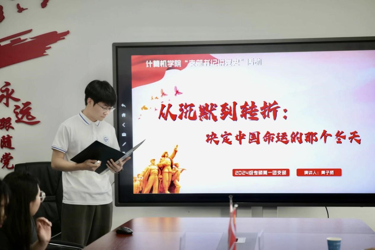 本科生信安党支部陈星以“改革攻坚,开放共赢”为主题,讲述党的十一届三中全会的召开、小岗村的“包干”历史、南海改革以及南方谈话四座历史丰碑呼吁广大青年党员继续坚持改革开放的思想。电子信息第一团支部黄子贤富有激情地讲述党的十一届三中全会召开时期邓小平以及陈云等优秀革命领导者的故事鼓舞我们要敢于改革创新。学硕计科第一党支部刘睿萌以培养“硅基人才”为话题从科教兴国到东湖高新激励学生们积极投身于科技创新的事业中。本科生计科党支部刘轩豪讲述了从邓小平南方谈话至今不断突破深化的改革历史。