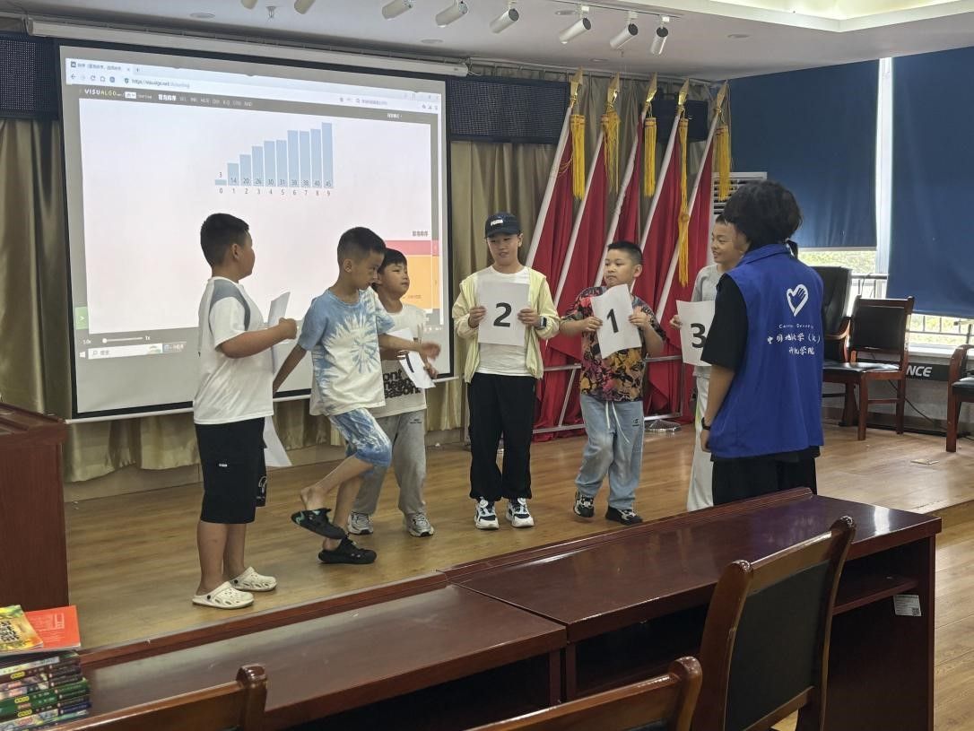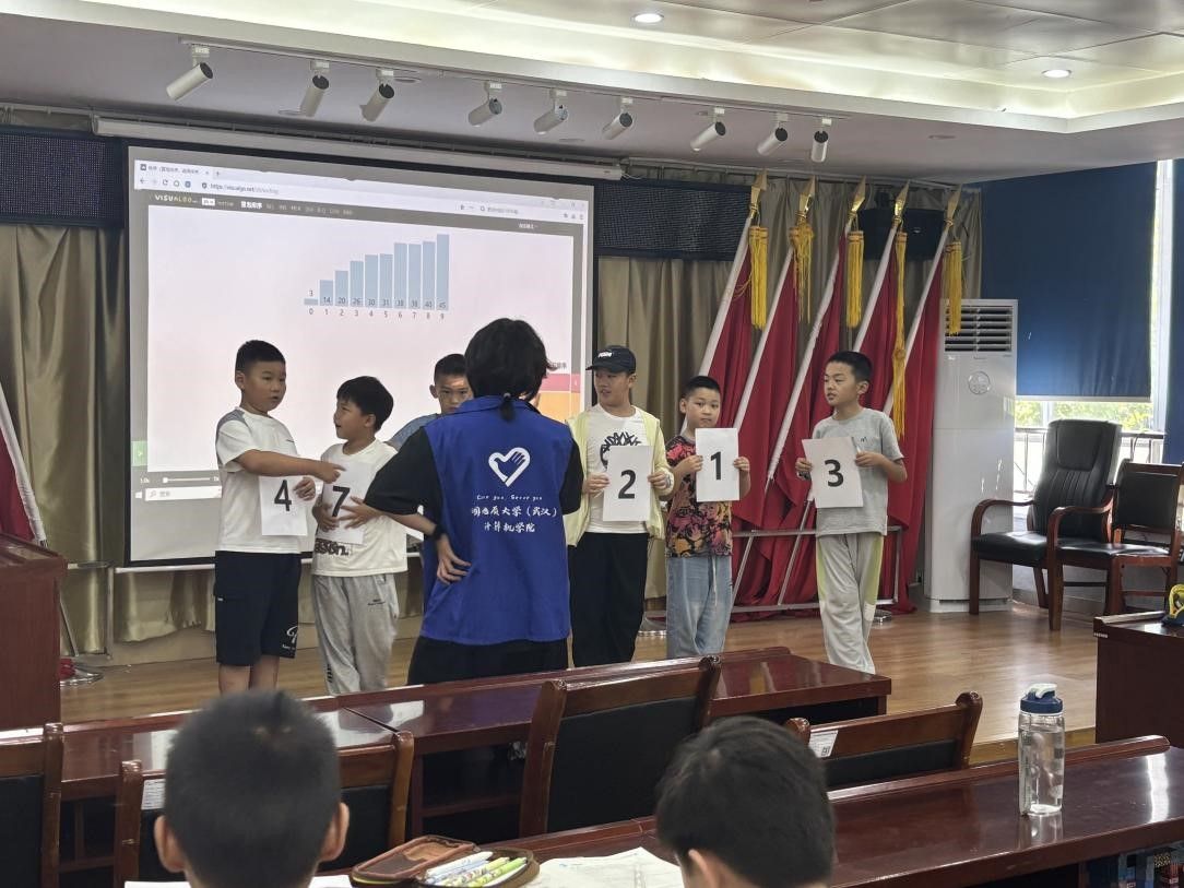 志愿者没有急于讲解原理,而是从生活聊起,排队买冰淇淋时怎么判断谁先谁后,整理书包时怎么把文具按大小归类,操场上怎样最快找到最高的那个人。这些看似寻常的小场景,其实都藏着排序的影子。孩子们一边听一边点头,时不时低声讨论,仿佛一下子发现了日常生活里原来有那么多“程序的逻辑”。