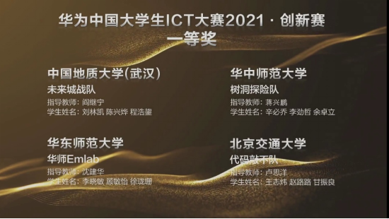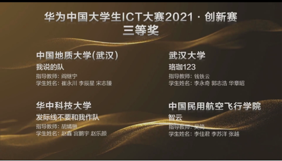 (通讯员刘林凯,阎继宁)近日,华为中国大学生ICT大赛2021全国总决赛落下帷幕,我院阎继宁老师指导的两支队伍均进入华为中国大学生ICT大赛2021·创新赛全国总决赛,并分别获得一等奖与三等奖的优异成绩。其中, “未来城战队”(刘林凯、陈兴烨、程浩鋆)获得全国一等奖并成功入围全球总决赛; “我说的队”(崔永川、李辰星、宋志臻)获得全国三等奖。