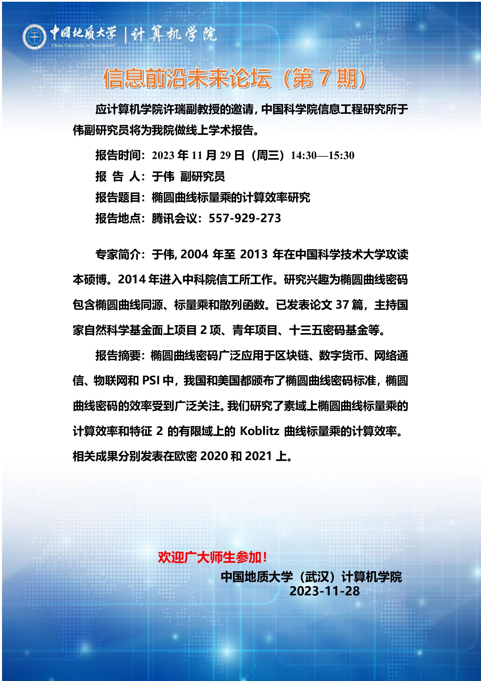 信息前沿未来论坛(第7期):中国科学院信息工程研究所于伟副教授——椭圆曲线标量乘的计算效率研究